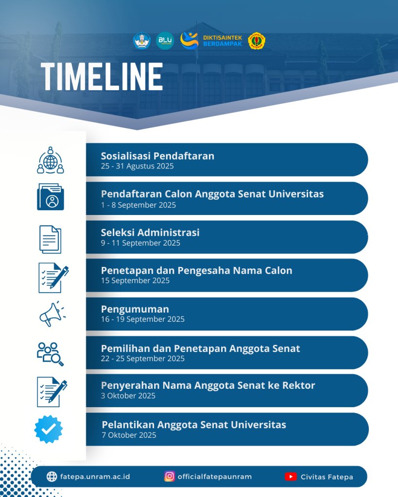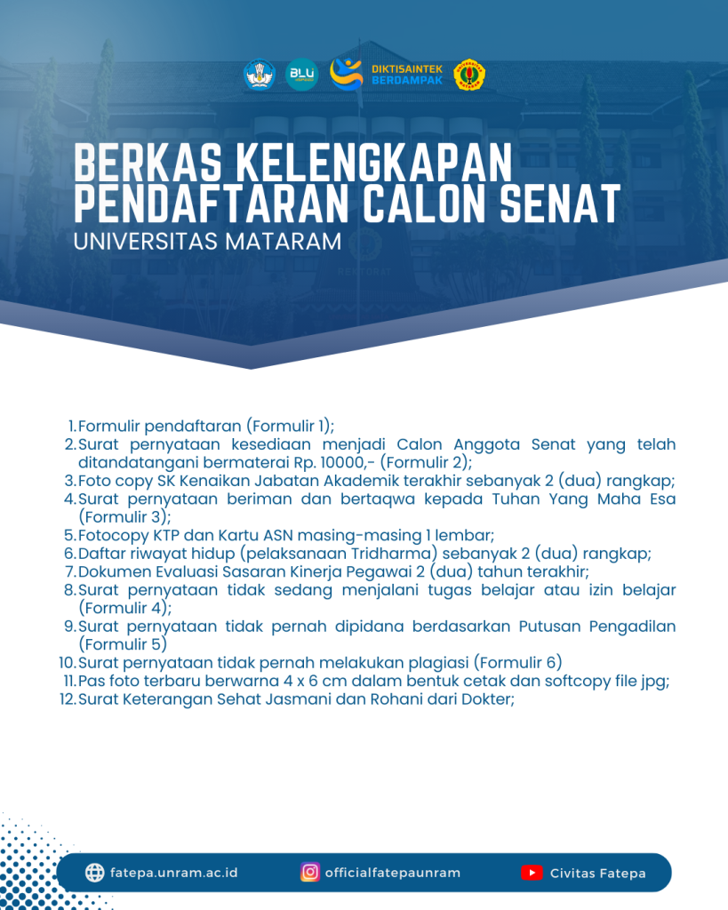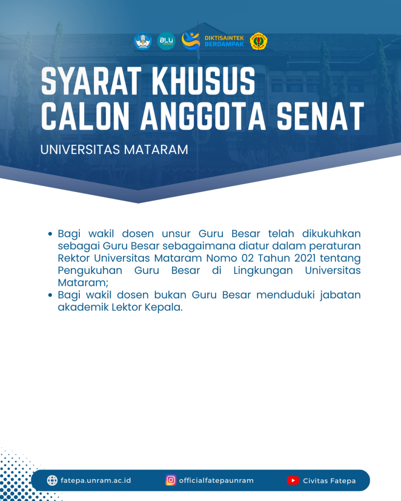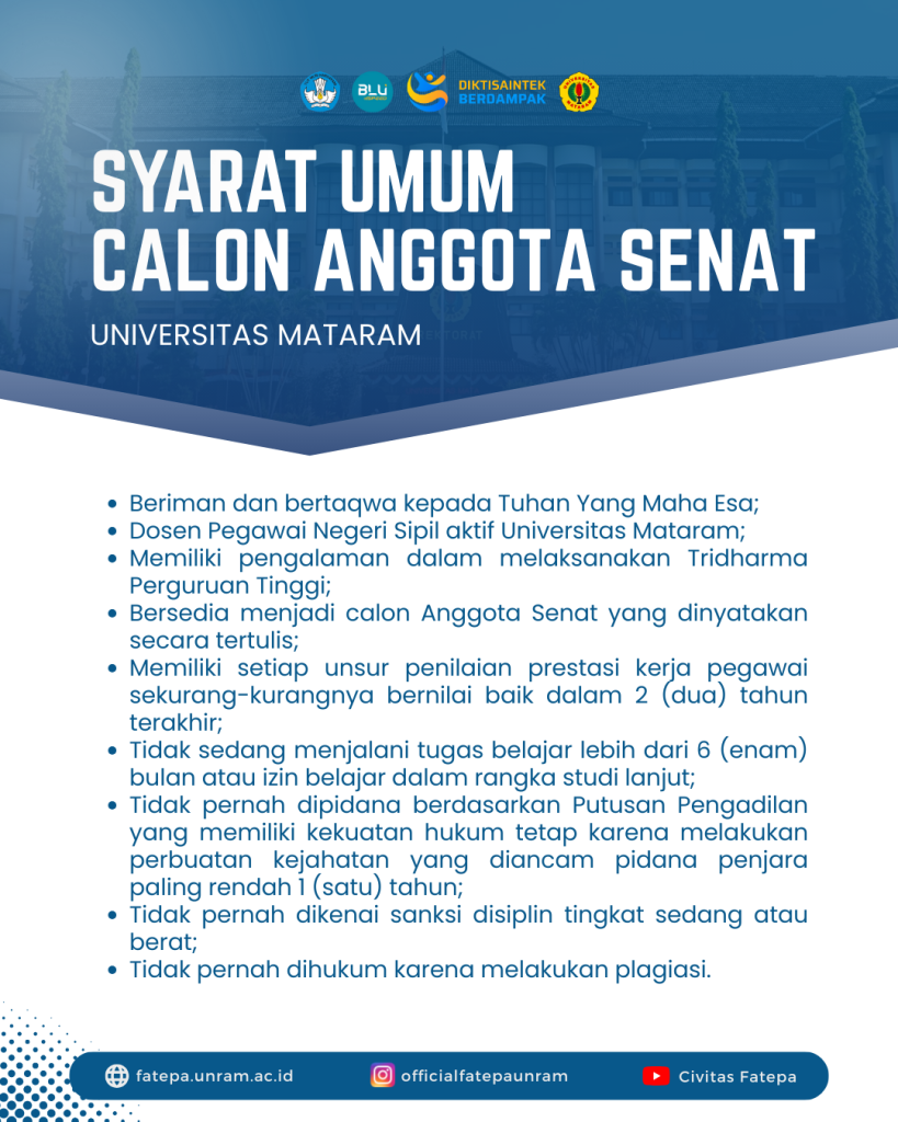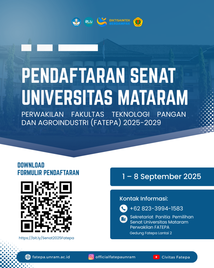 Kami mengundang Bapak/Ibu yang memenuhi syarat untuk mendaftarkan diri sebagai calon anggota Senat Universitas Mataram perwakilan Fakultas Teknologi Pangan dan Agroindustri.